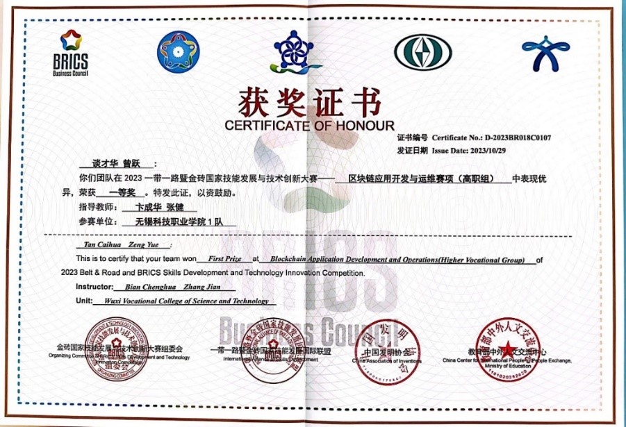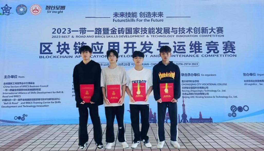 10月27日,2023一带一路暨金砖国家技能发展与技术创新大赛“区块链应用开发与运维竞赛”在重庆城市职业学院举行,大赛为期3天,共有来自国内外的115支队伍参赛。我校物联网与人工智能学院教师卞成华、张健指导的软件技术专业学生谈才华、曾跃团队荣获一等奖,人工智能技术应用专业学生叶文敬、卢奔奔团队获优秀奖,学校获最佳组织奖。
