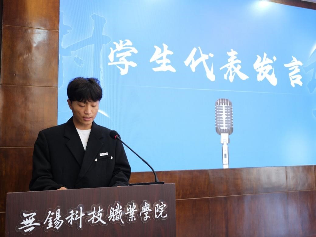 机电(试点)2202班班长朱韵青代表村田工匠班的同学做表态发言,他表示要珍惜零距离接触的学习机会,勤练技能、精益求精,夯实各项专业技能水平,磨砺出精湛技艺,力争将自己打造成新时代的新吴工匠。