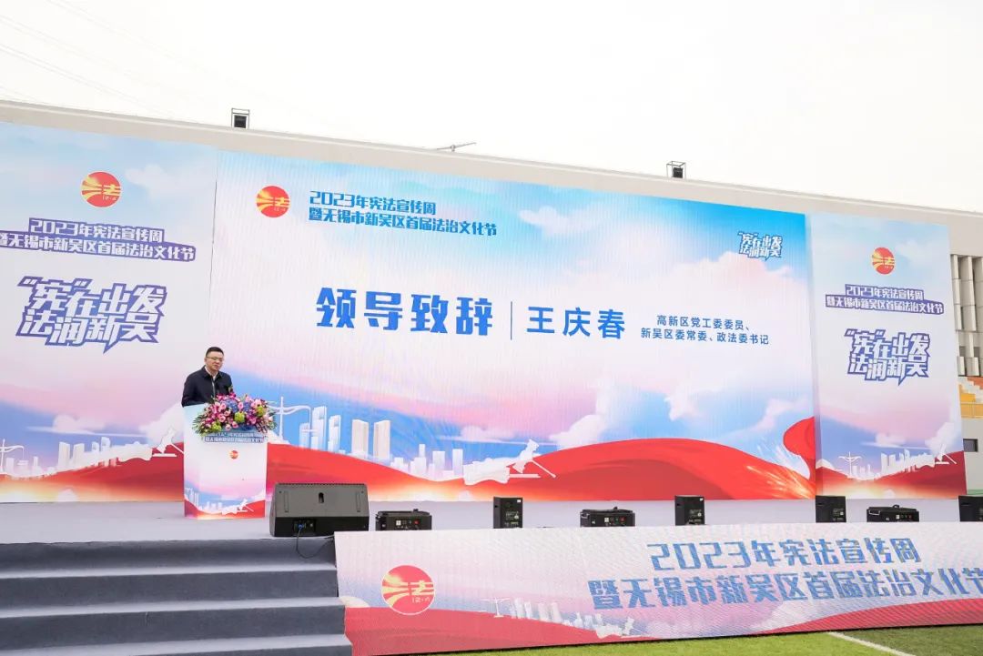 高新区党工委委员、新吴区委常委、政法委书记王庆春在开幕式上致欢迎词。王庆春指出,近年来,在区委区政府的统一领导下,全区各级各部门充分发挥各自职能优势,逐步健全、完善了普法宣传和法治建设工作机制,积累了宝贵经验,取得了丰硕成果。此次法治文化节的举办是新吴区“八五”普法工作的一大创新举措,为法治文化建设注入了新活力。希望各单位能够以此次活动为契机,继续乘势而上、巩固扩大成果,推动法治文化和法治实践齐头并进,让社会主义法治文化建设在新吴开花结果,为新吴争当中国式现代化先行示范区提供坚强法治保障。
