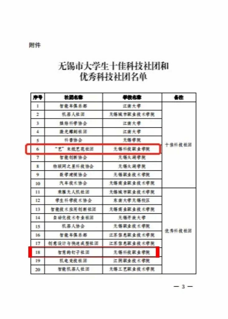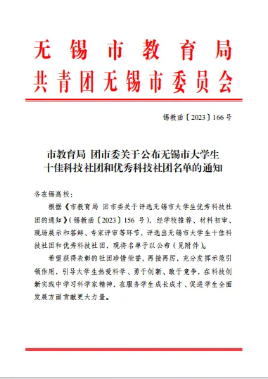 近期,市教育局、团市委公布了无锡市大学生十佳科技社团和优秀科技社团名单,我校艺“束”纸艺花社团与智慧的钉子社团在此次评选中表现优异,分别荣获2023年“无锡市大学生十佳科技社团”、2023年“无锡市大学生优秀科技社团”。