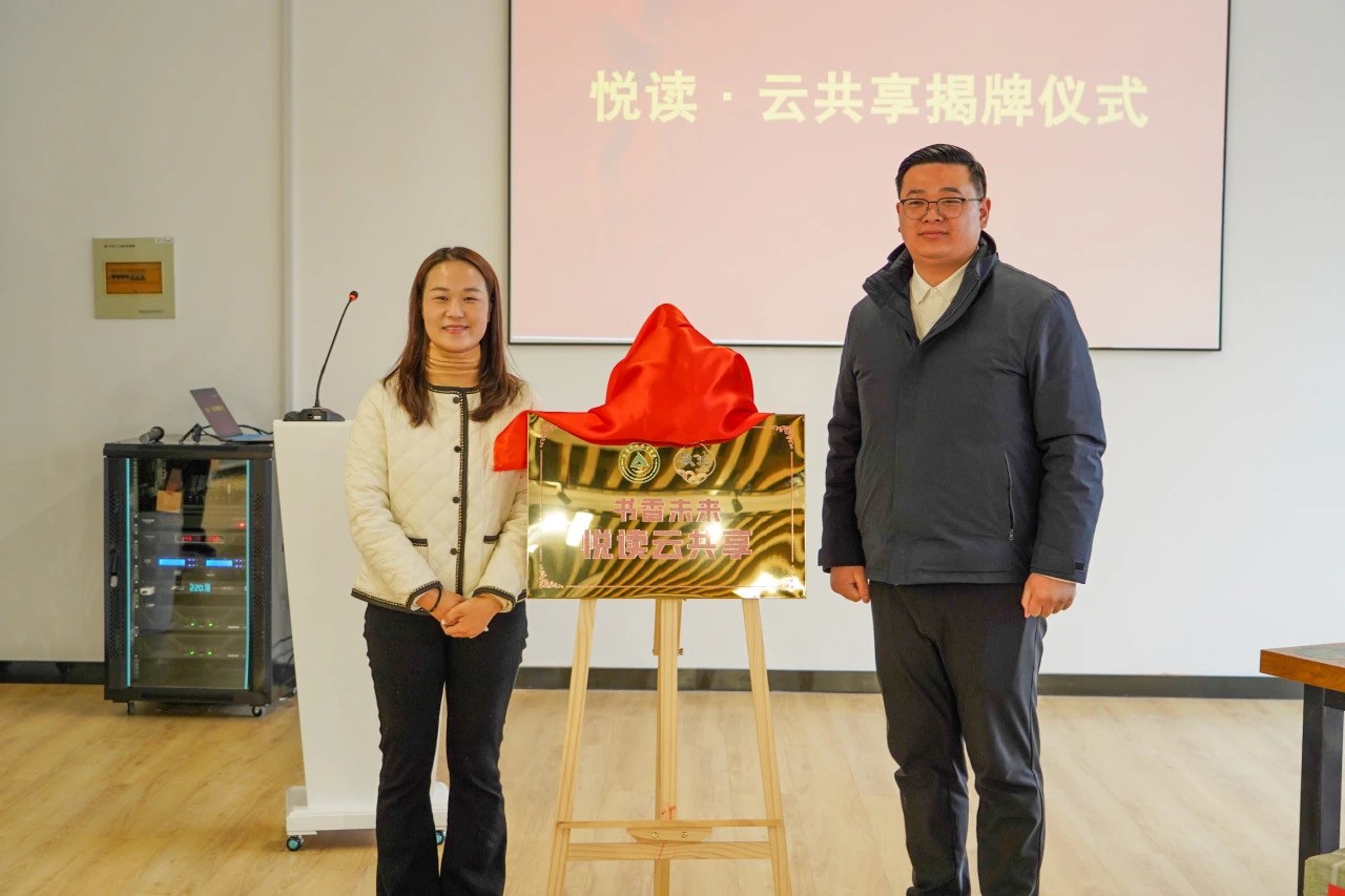 周飞校友与图书馆馆长钱雯共同为我校“悦读·云共享”平台揭牌。