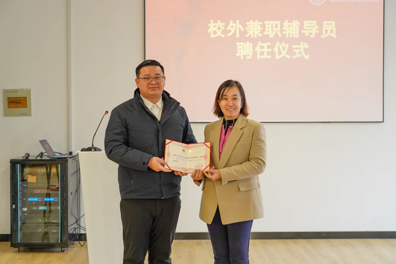 仪式上,学生工作处处长杨玲燕向周飞校友颁发校外兼职辅导员。