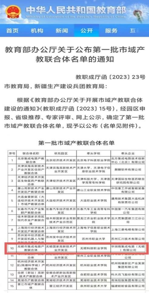 9月28日,依托无锡国家高新技术产业开发区,由我校与华润微集成电路(无锡)有限公司共同牵头申报的无锡市集成电路产教联合体成功入选国家第一批市域产教联合体。10月12日,由我校与中科芯集成电路有限公司、南京邮电大学共同牵头组建的全国半导体行业产教融合共同体在第60届中国高等教育博览会上成立,政产企校合力服务和促进产业高质量发展。