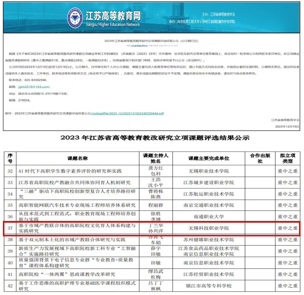 成立无锡高新区产学研协同创新研究院,架构“科院+”特色的校级科研平台生态体系。获批工信部中小企业发展促进中心第一批“专精特新产业学院”建设项目,首次申获无锡市重点实验室1个,首次申获省社科普及基地1个,首次荣获省哲学社会科学优秀成果奖1项,再获省高职院校工程技术研究开发中心1个,全校2023年科研项目到账总经费1228万元,科研创新实力迈上新的台阶,学校再获中国产学研合作创新奖。