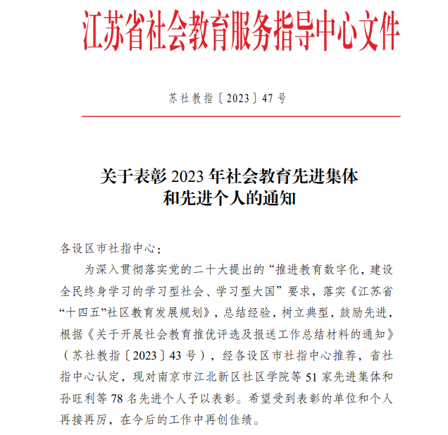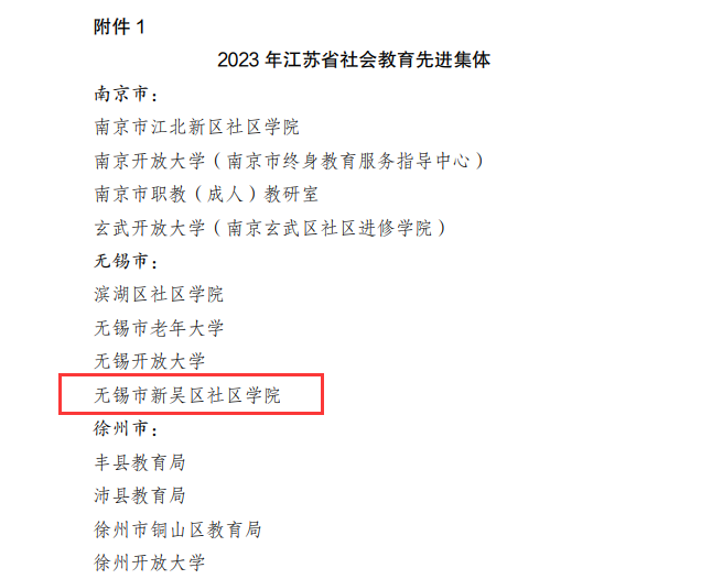 日前,江苏省社会教育服务指导中心印发《关于表彰2023年社会教育先进集体和先进个人的通知》,无锡市新吴区社区学院获评“江苏省社会教育先进集体”。