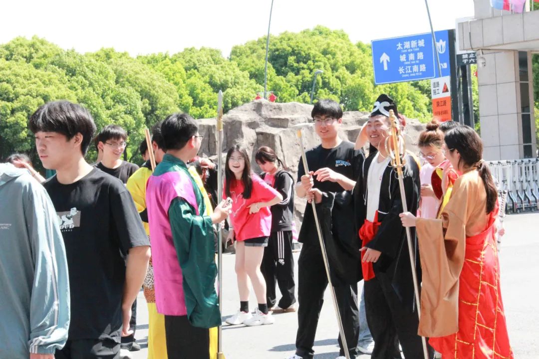 在校园东门处,每位同学参与了团队打卡拍照,不少同学纷纷与队友互动、拍照留念。