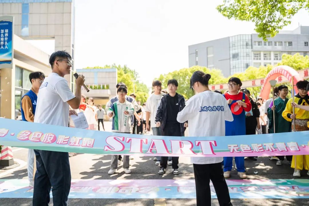 “五四青春赋能系列活动”启动后,由发起人李汉、夏芳芳同学组织的“无色彩 不青春”多巴胺彩虹跑活动在学校南门举行。报名本次多巴胺彩虹跑活动共34支队伍,共计124名师生参加。