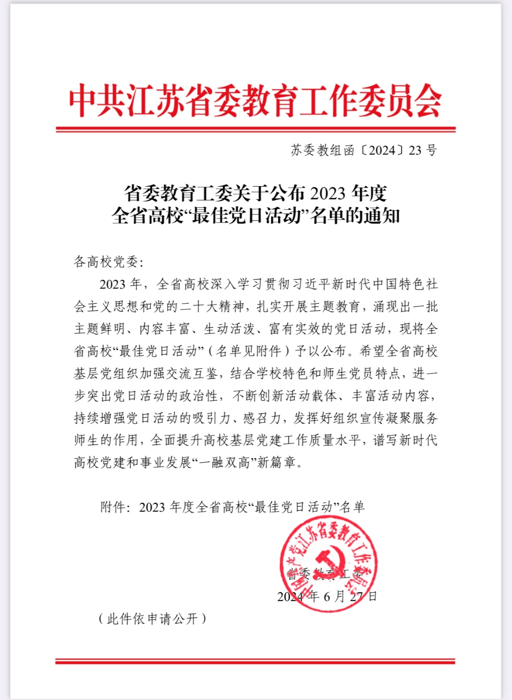 近日,江苏省委教育工委公布了全省2023年度高校“最佳党日活动”评选结果,我校制造系党支部《党建赋能“诊研结合”,服务企业“智改数转”》主题党日活动,入选2023年度全省高校“最佳党日活动”名单。