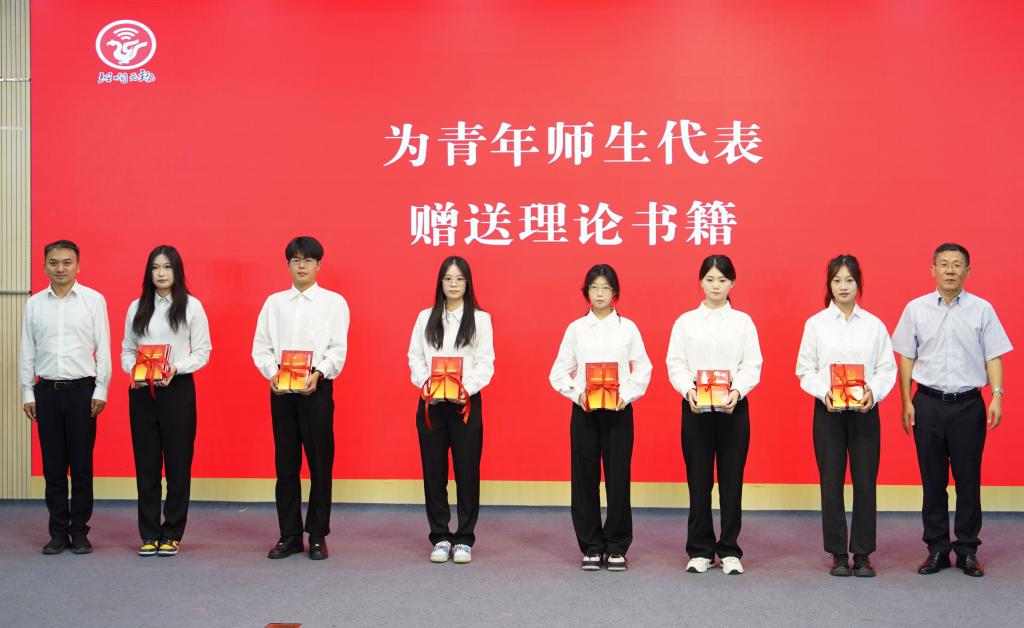 无锡高新区党工委委员、新吴区委常委、宣传部部长朱晓峰与我校党委书记张国华向师生代表赠送理论书籍。