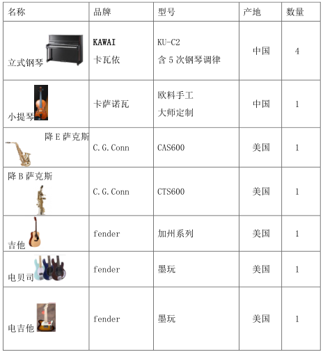 采购项目概况、要求:大学生活动中心琴房拟采购的乐器包括钢琴、萨克斯、二胡、古筝、吉他(古典/电子)、电贝司、架子鼓等乐器,具体明细如下: