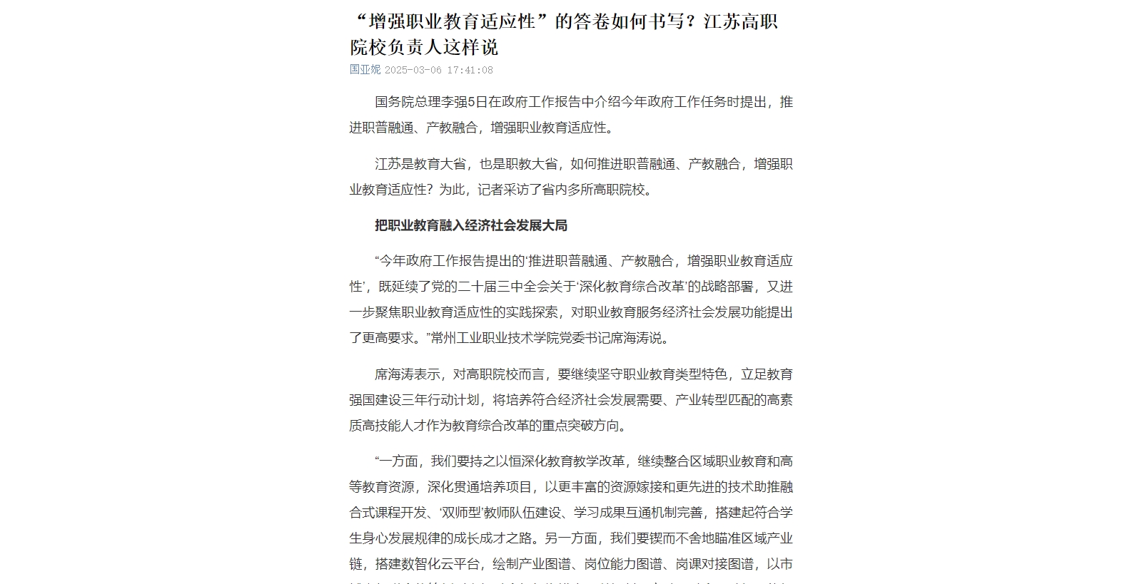 下一篇:中国江苏网:“增强职业教育适应性”的答卷如何书写?江苏高职院校负责人这样说