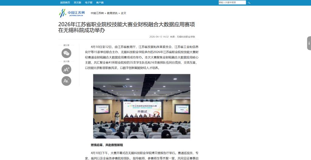 下一篇:新华报业网:2026年江苏省职业院校技能大赛业财税融合大数据应用赛项在无锡科院成功举办