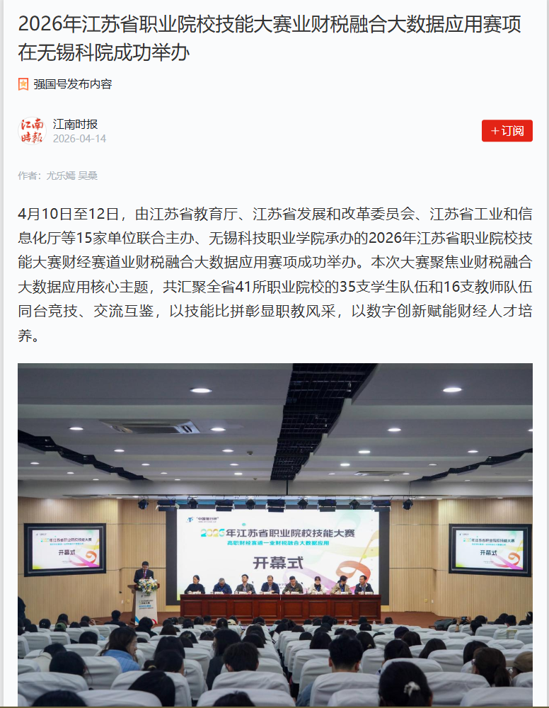 下一篇:中国江苏网:2026年江苏省职业院校技能大赛业财税融合大数据应用赛项在无锡科院成功举办