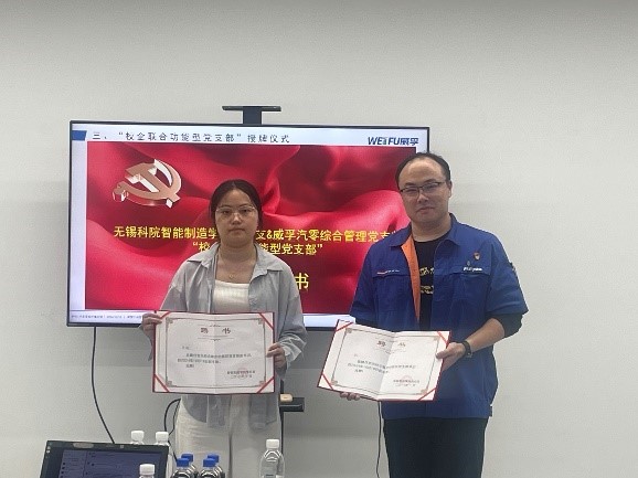 为进一步探索党建工作新思路、新方法,坚持“校企联合党建”引领“校企合作育人”理念,系牢“校企”联合纽带,确保学生在校外岗位实习关键时段的培训教育不断线。10月18日,我校智能制造学院党总支和威孚汽零综合管理党支部举办”校企联合功能型党支部”授牌仪式暨岗位实习学生汇报会。威孚高科技集团有限公司组织人事部部长徐娇、威孚汽零综合管理党支部书记兼人事行政经理杨彦、制造支部书记兼制造一部经理徐晓春,智能制造学院党总支书记鲍都娇、院长张国新等参加活动。