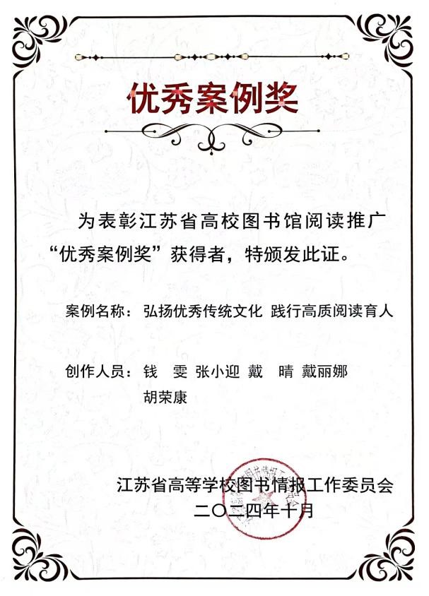 大会表彰了62项江苏省高校图书馆阅读推广“优秀案例”,我校《弘扬优秀传统文化 践行高质阅读育人》案例入选。