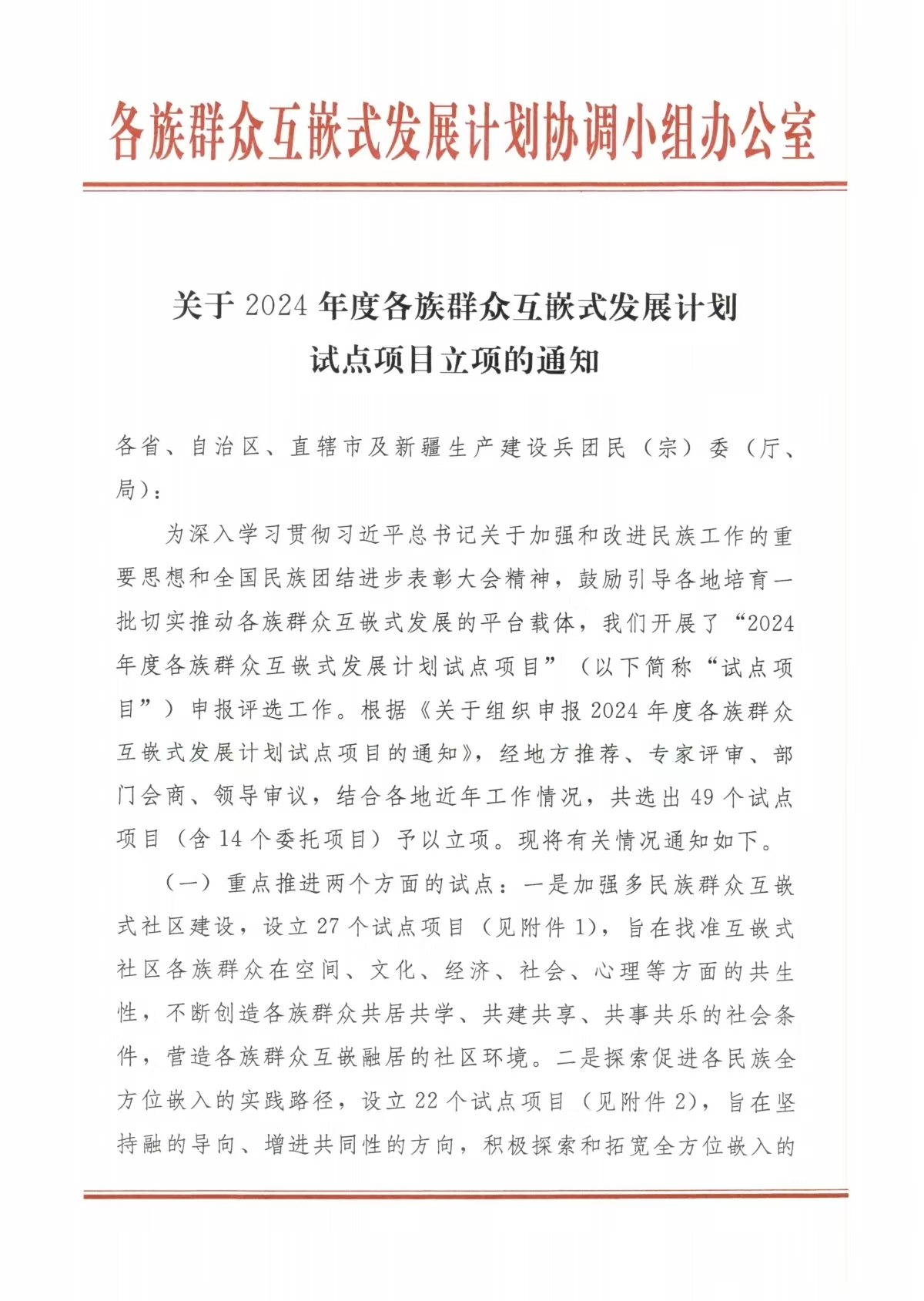 自2022年开始,中央统战部、国家民委、国家发展和改革委员会、人力资源和社会保障部、公安部、国务院国资委、全国工商联印发《关于实施各族群众互嵌式发展计划的意见》,决定实施各族群众互嵌式发展计划,创新推进各民族交往交流交融,不断铸牢中华民族共同体意识。