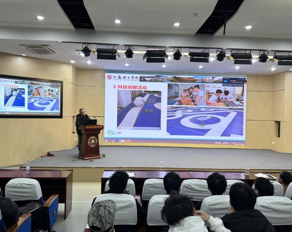 在讲座中,俞洋院长首先向同学们全面介绍了江苏理工学院的概况、鲜明的办学特色、悠久的联合培养历史以及雄厚的师资力量。展示了学校的创新创业基地和学生就业情况,为同学们描绘了一幅充满希望的未来图景。强调团队合作的重要性、沟通协作的要点以及终身学习的必要性,鼓励同学们保持主观能动性和持久自驱力,勇于面对挑战,不断成长。随后,俞院长详细介绍了各类创新创业机会和平台,并展示了气垫小车这一创新成果,深入剖析了其原理及背后学生团队付出的艰辛努力。他鼓励同学们相信自己的潜力无限,要将所学知识转化为能力,追求更高的目标。在互动交流环节中,同学们和各位老师们就未来发展和专业疑惑进行了深入探讨,老师们都表示将全力支持同学们的学习和发展,为他们的顺利毕业和未来发展提供有力保障。最后,老师们对同学们提出了殷切期望,希望他们心怀希望、脚踏实地、关爱他人,共同创造幸福人生。