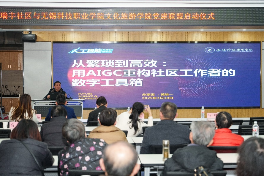 活动中,文化旅游学院党总支书记黄唯一以《用AIGC重构社区工作者数字工具箱》为题,为瑞丰社区社区工作者作讲座,展示了 AIGC 技术如何构建起覆盖效率提升、服务优化、决策支持的全方位数字工具箱,为社区工作者应对基层治理的复杂性和多样性提供了技术支撑,推动基层治理向更智慧、更高效、更有温度的方向迈进。