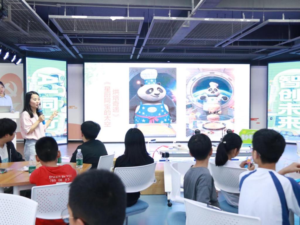 “生成式AI设计创作”课堂则将孩子们带入了人机协作、共创未来的前沿领域。紧扣“AI同行”的主题,青少年们深度体验了包括DeepSeek、豆包、即梦等在内的国内主流AI大模型。在学院师生的引导下,孩子们兴奋地探索了这些工具的多种应用场景,他们化身为小小“AI训练师”和“创意总监”。他们大胆输入自己的奇思妙想——“孙悟空拿AK大闹灵界”、“蒙娜丽莎在现代都市”、“牛顿闯入MC”——亲眼见证AI如何将这些抽象的构想转化为生动的画面或视频片段。这个过程充满了惊叹与欢笑,抽象的“人工智能”概念,在孩子们亲手操作、即时反馈的互动中,变得真实可感、乐趣无穷。这不仅是一次技术工具的学习,更是一场关于未来创作形态的头脑风暴,深刻诠释了“与AI同行,智创未来”的活动内涵。