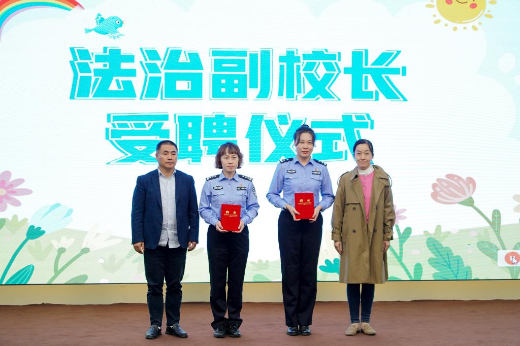 保卫处处长徐海东、学生工作处处长杨玲燕给新吴公安分局许人方、彭晓玲警长颁发法制副校长聘书