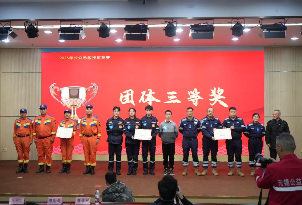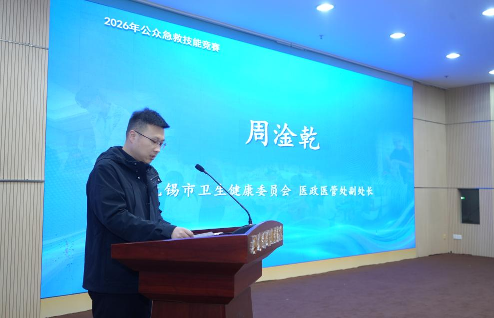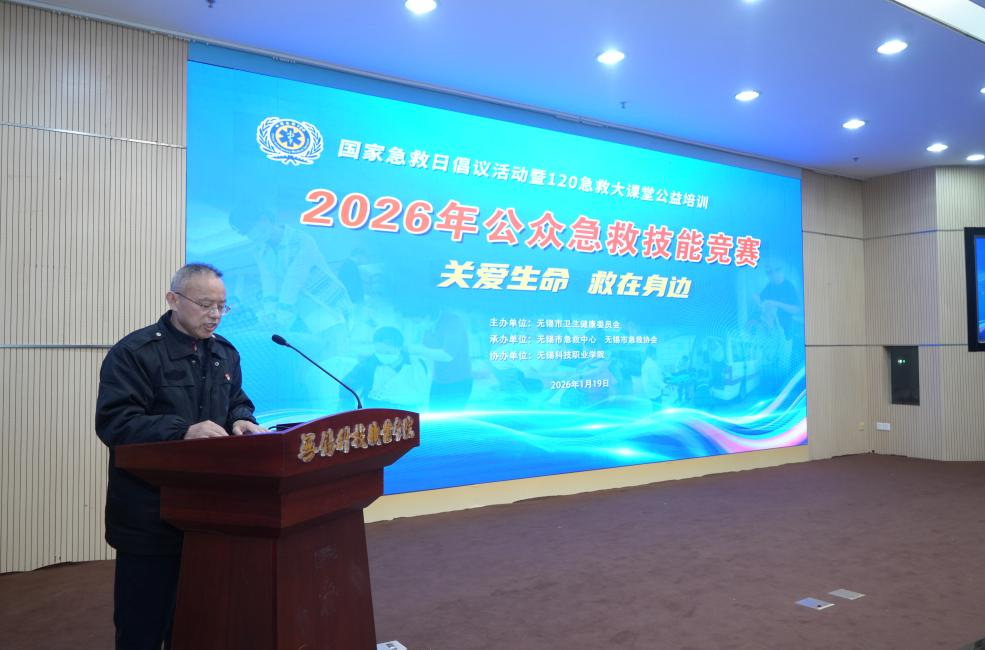 1月19日下午,2026年无锡市公众急救技能比赛在我校博文楼报告厅圆满落幕。本次活动由无锡市卫生健康委员会主办,市急救中心与市急救协会承办,我校协办并全程提供保障服务。 无锡市卫生健康委员会医政医管处副处长周淦乾、无锡市急救中心主任周海川、无锡市急救中心党委副书记、市急救协会秘书长钱兴才,我校副校长王锡刚出席活动。