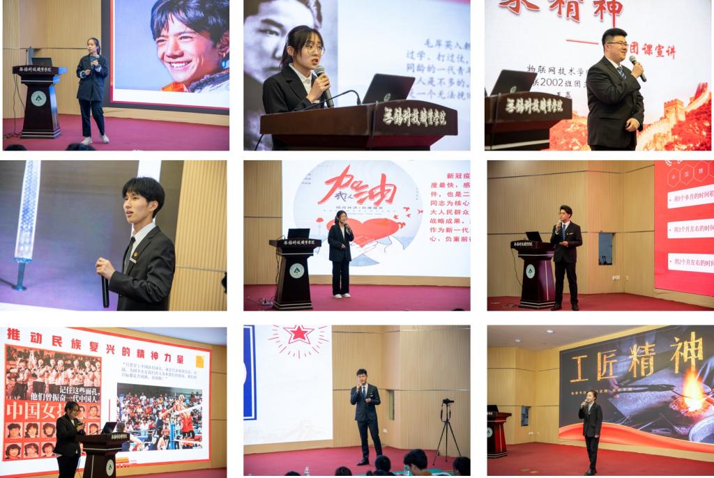 首先登场的芮云驰通过娓娓道来“脱贫攻坚精神”引导广大团员青年在学习和工作中,既要攻坚克难,又要勇于开拓创新。葛佩珩通过英雄事迹生动地讲述中国共产党艰苦创业精神。王赢饱含深情的“沂蒙精神”阐释震撼人心。何欢以问答形式展开他的演讲,他从“越王勾践剑”引领同学们体验新时代大国工匠精神。秦聪聪与菅学辉分别通过视频引入和提问导入的方式进行了精彩演绎。赵子萌的“女排精神”通过风趣幽默、别具匠心的现场互动,将大赛推至高潮,带着现场的观众在轻松愉快的氛围中学习“女排精神”,感受中国体育健儿为祖国争光的强大动力。马千里的“铁军精神”激励广大团圆青年不忘初心、牢记使命、坚定信仰、勇敢斗争,为新时代全面建设社会主义现代化国家而不懈奋斗。吴艺伟则立足高职院校的人才培养理念,通过阐释“大国工匠”精神激励广大团员要热忱实践“弘毅守正、盈科匠心”的校训!