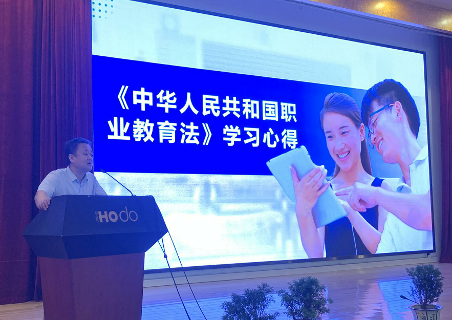在参观交流之后,院长胡光明为参加活动的全体党员和骨干教师上了一堂党课,学习新修订的《中华人民共和国职业教育法》。胡院长通过分析新法修订内涵,归纳新法突出亮点,从法条内容中归纳出“质量”“劳动”“素质”“技能”“人才”“企业”等核心关键词,通过这些关键词梳理法条核心内容,突出分析新法亮点重点。胡院长强调,新《职业教育法》重在加强党的领导,强调职教地位,加强统筹管理,推进体系贯通,明确企业主体,坚持多元办学,深化产教融合,突出就业导向,强调德技并修,完善保障机制,作为从事高职教育的一线教师,人人都应学习领会,把新职教法的精神刻入头脑中,做到行动上。