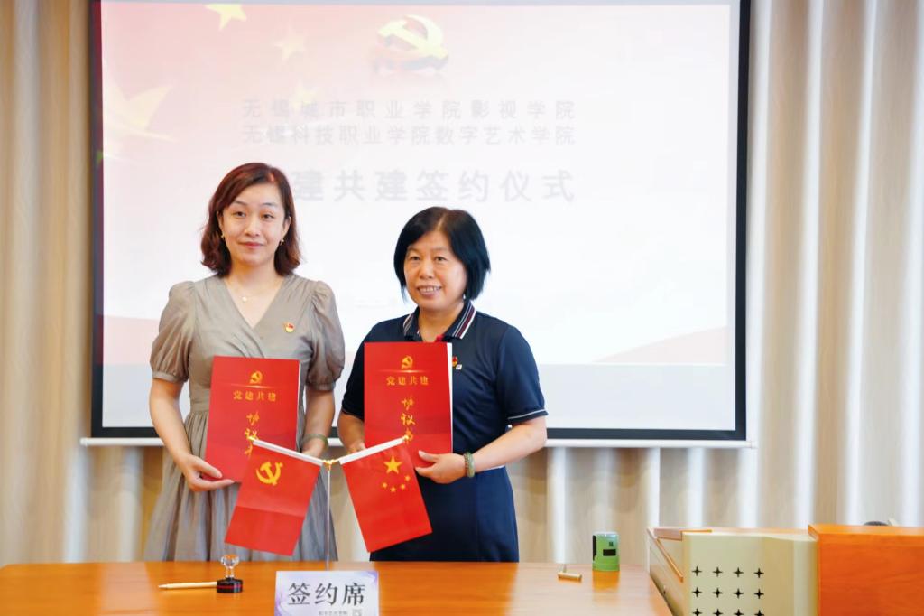 在中国共产党成立101周年到来之际,为全面贯彻落实党的教育方针,形成校际基层党建工作互带互动、优势互补、资源共享、共同发展的新格局,6月29日,我校数字艺术学院与无锡城市职业技术学院影视学院党总支举行了两院党建 “结对共建”签约仪式暨主题党日活动。签约仪式在学校社区学院二楼展示中心举行,我校宣传统战部部长赵娴,组织部副部长夏沁,数字艺术学院党总支副书记杨玲燕,影视学院党总支副书记左占卫以及双方党员教师代表20余人参加活动。