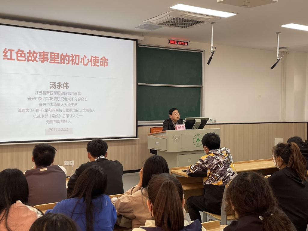 10月12日下午,学校特邀请江苏省新四军研究会理事会理事、太华新四军研究分会会长、红色烈士后代汤永伟在我校博雅楼110为师生讲授《红色故事里的初心使命》专题讲座,近110名师生参加了学习。马克思主义学院院长周雪梅教授主持活动。