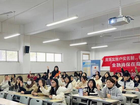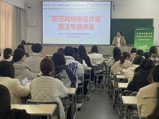 在“3·15国际消费者权益日”即将到来之际,中国邮政储蓄银行无锡分行工作人员来到商学院教室开设“金融小课堂”,他们现场张贴宣传横幅、发放宣传单页、面对面答疑解惑,以“案”释法,砌好金融“安全墙”,加强学生自我防护能力。