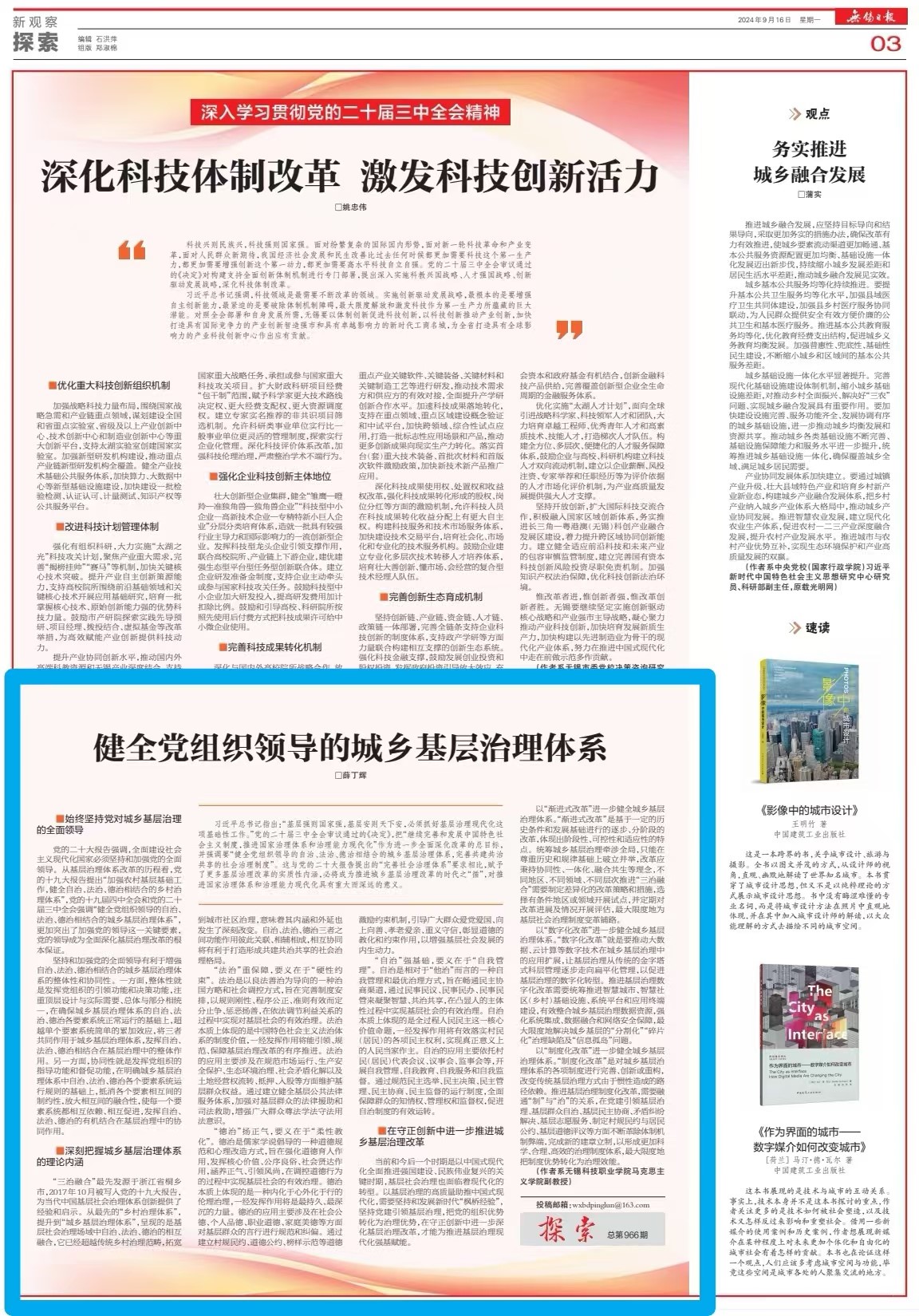 9月16日,《无锡日报》理论版刊发我校基础部薛丁辉副教授、博士后理论文章《健全党组织领导的城乡基层治理体系》。党的二十届三中全会强调,“健全党组织领导的自治、法治、德治相结合的城乡基层治理体系”,党的领导成为全面深化基层治理体系改革的根本保证。文章深刻剖析了城乡基层治理体系的理论内涵,并指出“自治”强基础,要义在于“自我管理”;“法治”重保障,要义在于“硬性约束”;“德治”扬正气,要义在于“柔性教化”,自治、法治、德治之间彼此关联、相辅相成,在相互协同中构建共建共治共享的社会治理格局。在守正创新中进一步以渐进式改革、数字化改革、制度化改革推进基层治理创新,这将有利于赋能基层治理体系和治理能力现代化。