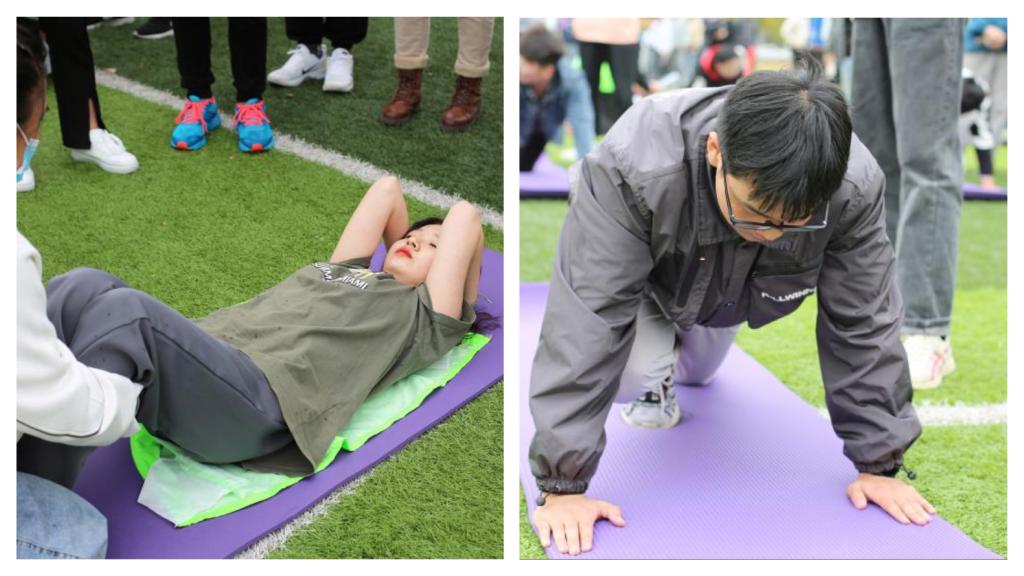 学校体育部老师带领全体参赛选手一起做了赛前热身,选手们情绪高涨,摩拳擦掌,准备一显身手。比赛共分为三个项目,分别是“团结协作集体俯卧撑”“不惧艰难团队仰卧起坐”,和“勇于创新花式无器械运动”,每支队伍以宿舍为单位参赛,有的队伍还邀请了老师助力参赛。每场比赛都精彩纷呈,选手们争分夺秒,一仰一起之间,显示着同学们的青春活力。活动间隙,学校舞龙队为大家带来了精心准备的舞龙表演,将活动推向了一个高潮。比赛进入白热化阶段,现场拉拉队为运动健儿们加油喝彩,即使天空中飘着细雨也阻挡不住同学们的热情。正是他们的鼓励使得运动健儿们咬牙坚持,奋斗到比赛的最后一秒。