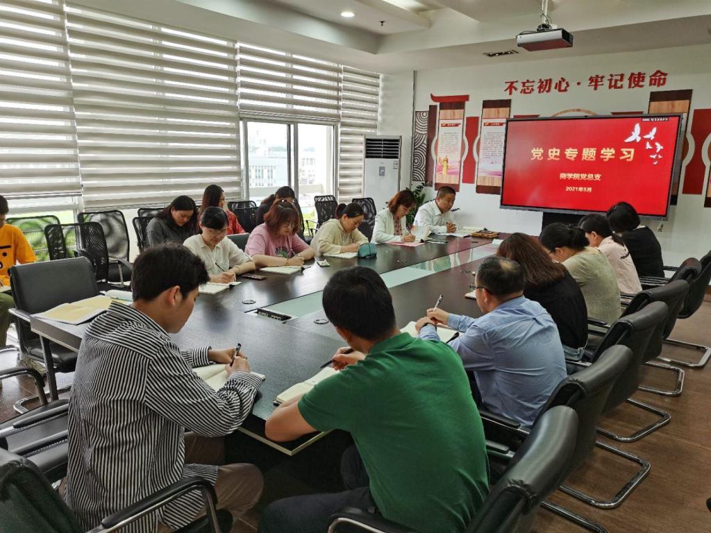 5月12日下午,商学院党总支在博文楼503会议室召开党史学习教育专题会议。全体教师党员、学生发展对象参会,党总支书记汤兴荷主持会议。