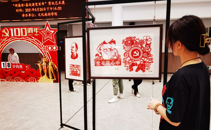为庆祝中国共产党的百年华诞,讴歌党的百年奋斗历程,激发同学们热爱祖国,热爱人民,热爱中国共产党的热情,5月26日下午文化旅游学院在E楼大厅拉开了为期三天的“颂盛世 喜迎建党百年”剪纸艺术展的序幕。此次挑选展出的近四十副剪纸作品是20级会展策划与管理专业的学生结合《地方非遗传承与创新》实践课程,为建党百年献上的一份独特的厚礼。本次剪纸艺术展从作品剪刻创作,到策划布展完成都是在任课教师的悉心指导下由学生自行完成,实践课程不仅让学生感受了传统非遗文化的魅力,更让他们懂得了不忘初心、牢记使命的价值意义。