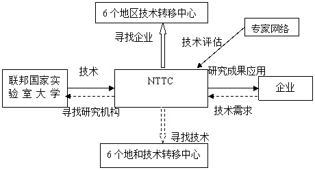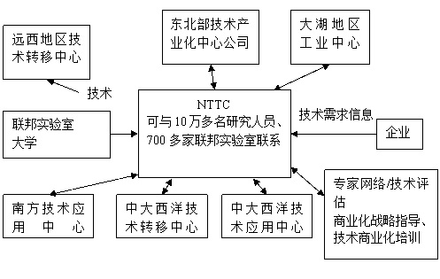 美国国家技术转移中心(NTTC)是经美国国会批准成立的国家级非营利性技术服务机构,全职工作人员110名,经费主要来自航空航天局、能源部和联邦小企业局等。经过多年的运作,美国国家技术转移中心形成了由联邦实验室和大学研究机构、企业、专家网络、6个地区技术转移中心组成的技术转移网络。