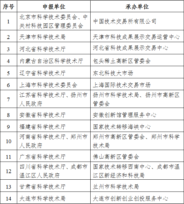 为深入贯彻落实《中共中央国务院关于构建更加完善的要素市场化配置体制机制的意见》,加快发展技术要素市场,建立健全科技成果常态化路演机制,按照《科技成果直通车工作指引》相关要求,建立常态化推动科技成果转化的工作体系和工作机制,科技部火炬中心对地方科技管理部门报送的2021年度“火炬科技成果直通车”工作方案进行了研究论证,综合考虑前期工作基础、重点任务安排、支撑保障条件等因素,确定中国技术交易所有限公司等14家单位作为2021年度“火炬科技成果直通车”承办单位。现将有关事项通知如下。