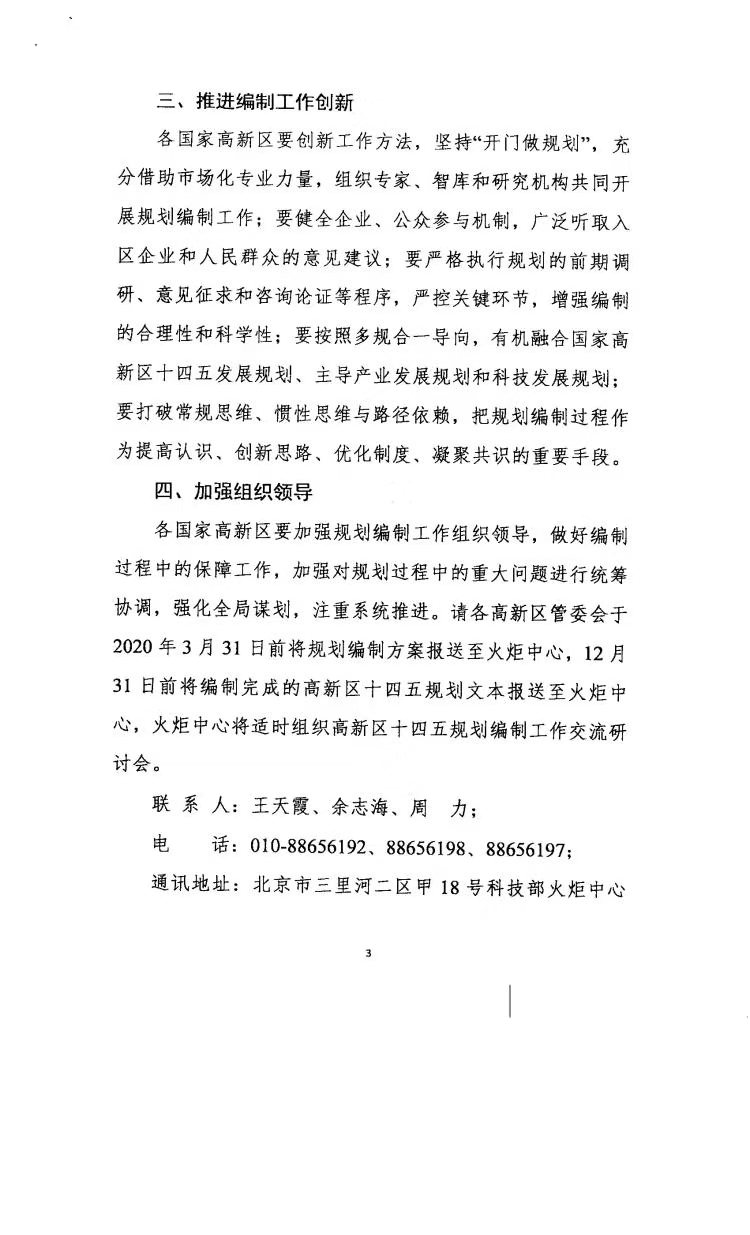 各国家高新区要加强规划编制工作组织领导,做好编制过程中的保障工作,加强对规划过程中的重大问题进行统筹协调,强化全局谋划,注重系统推进。请各高新区管委会于2020年3月31日前将规划编制方案报送至火炬中心,12月31日前将编制完成的高新区十四五规划文本报送至火炬中心,火炬中心将适时组织高新区十四五规划编制工作交流研讨会。