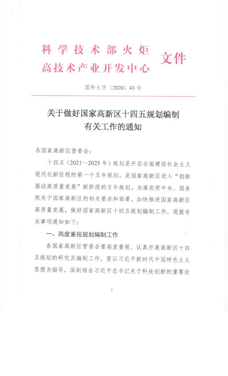 十四五(2021—2025年)规划是开启全面建设社会主义现代化新征程的第一个五年规划,是国家高新区进入“创新驱动高质量发展”新阶段的五年规划。为落实党中央、国务院关于国家高新区的相关要求和部署,加快推进国家高新区高质量发展,做好国家高新区十四五规划编制工作,现就有关事项通知如下: