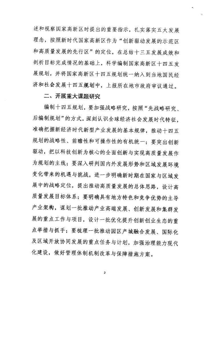 各国家高新区管委会要高度重视、认真开展高新区十四五规划的研究及编制工作,要以习近平新时代中国特色主义思想为指导,深刻领会习近平总书记关于科技创新的重要论述和视察国家高新区时提出的重要指示,扎实落实五大发展理念,按照新时代国家高新区作为“创新驱动发展的示范区和高质量发展的先行区”的定位,在总结十三五发展成效和剖析目标完成情况的基础上,科学编制国家高新区十四五发展规划,并将国家高新区十四五规划统一纳入到当地国民经济和社会发展十四五规划中,上报所在地市政府审议通过。