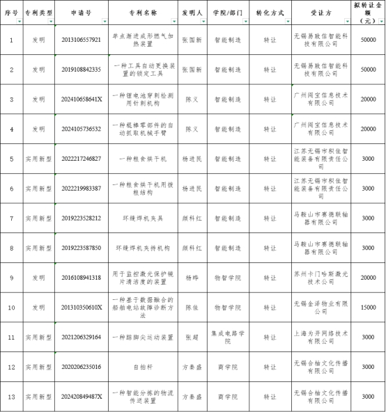 现根据《专利及成果转化管理办法(修订)》(锡科院发〔2025〕10号)相关要求,现将13项专利(拟转让金额共计拾玖万陆千元)的基本信息予以公示: