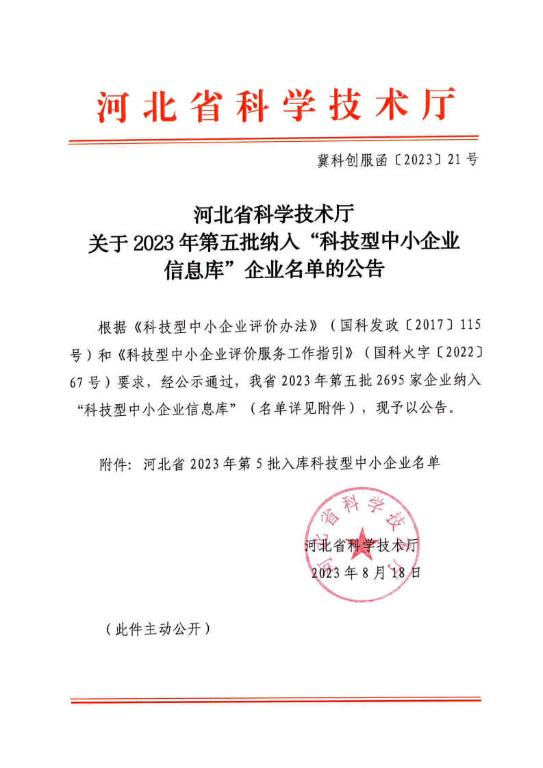 河北省2023年第5批入库科技型中小企业名单公告正文.jpg PICTURE