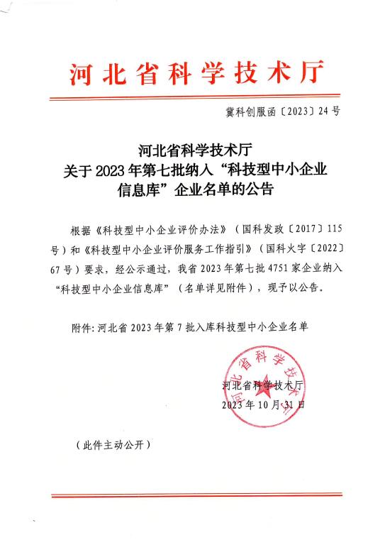 河北省2023年第7批入库科技型中小企业名单公告正文.jpg PICTURE
