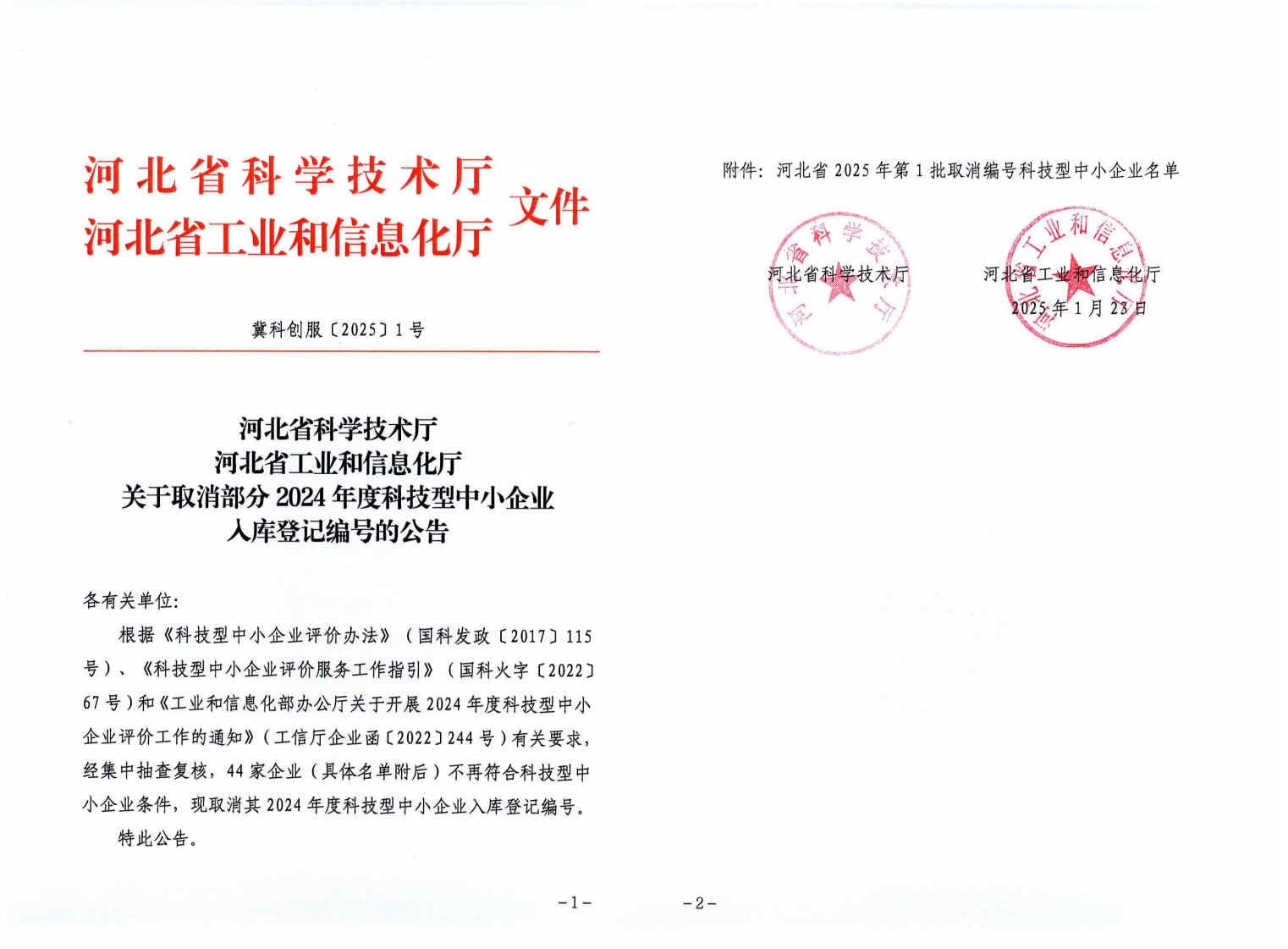 关于取消部分2024年度科技型中小企业入库登记编号的公告(冀科创服[2025]1号).jpg PICTURE