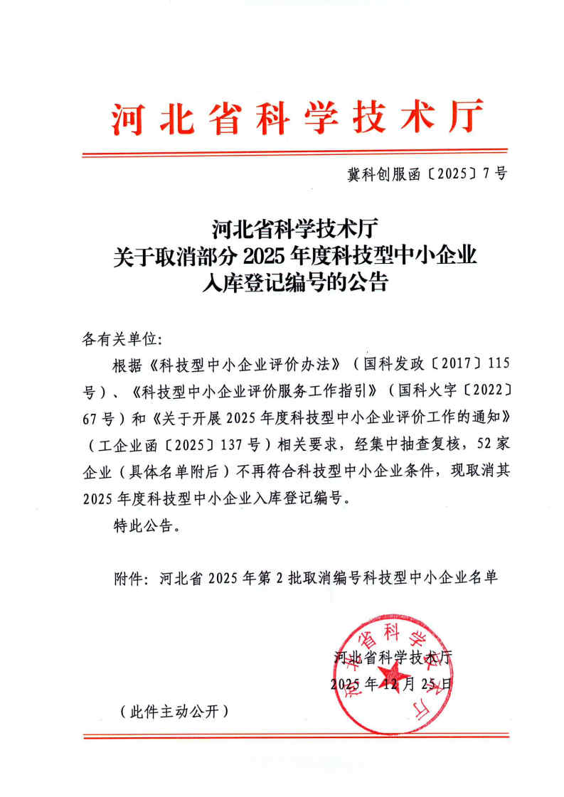 关于取消部分2025年度科技型中小企业入库登记编号的公告+(冀科创服函〔2025〕7号).jpg PICTURE
