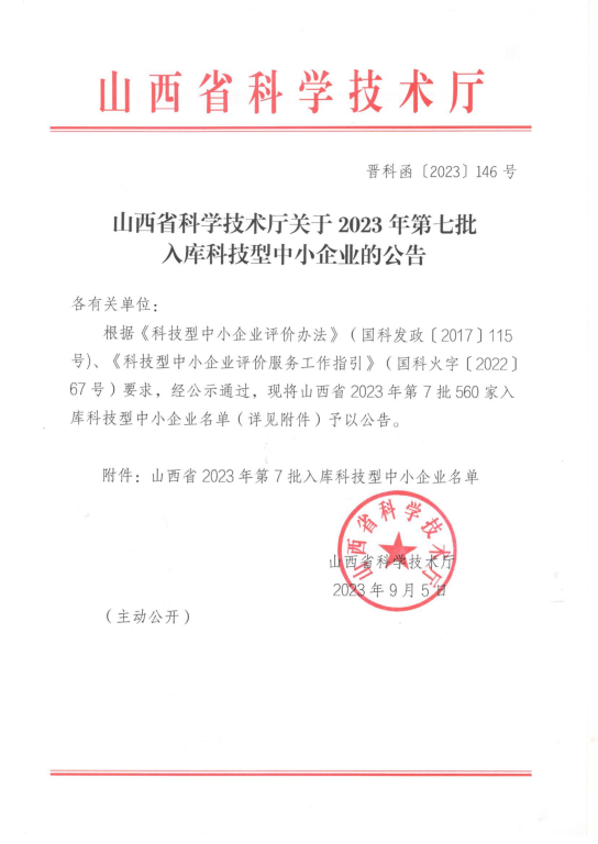 山西省2023年第7批入库科技型中小企业名单公告正文.jpg PICTURE