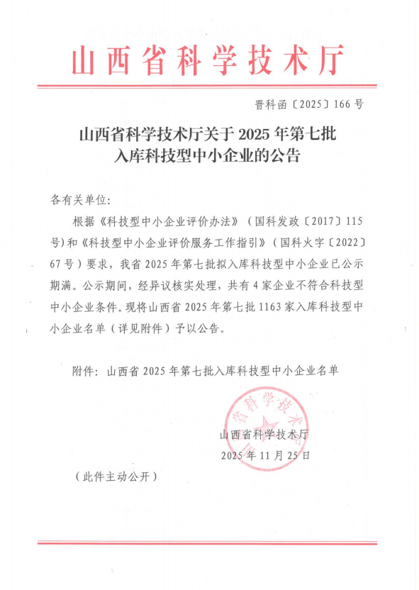 山西省2025年第7批入库科技型中小企业名单公告正文.jpg PICTURE