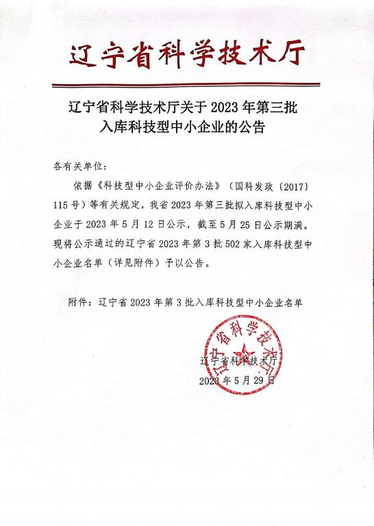辽宁省2023年第3批入库科技型中小企业名单公告正文.jpg PICTURE