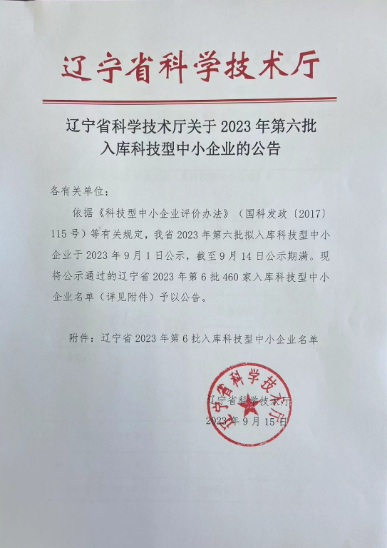 辽宁省2023年第6批入库科技型中小企业名单公告正文.jpg PICTURE
