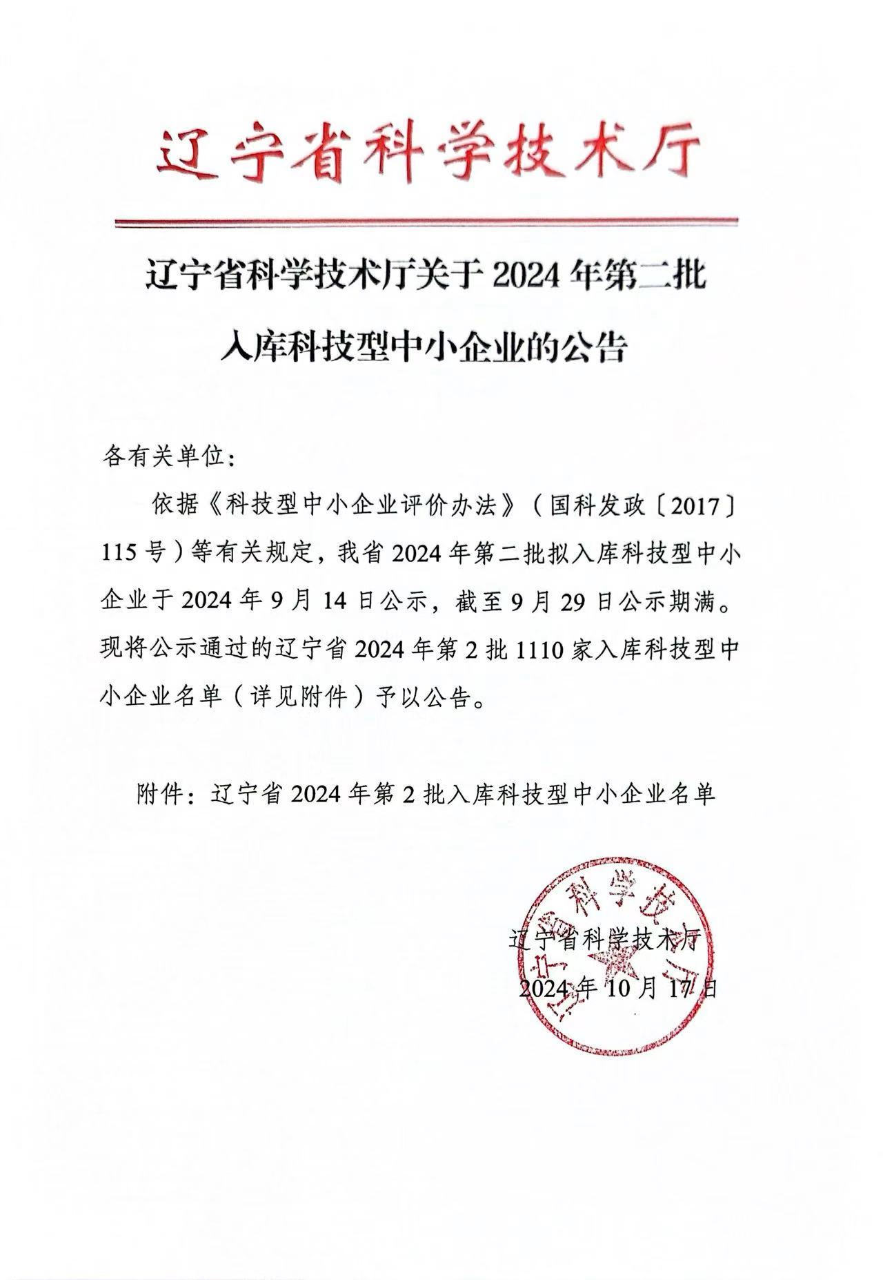 辽宁省2024年第2批入库科技型中小企业名单公告正文.jpg PICTURE