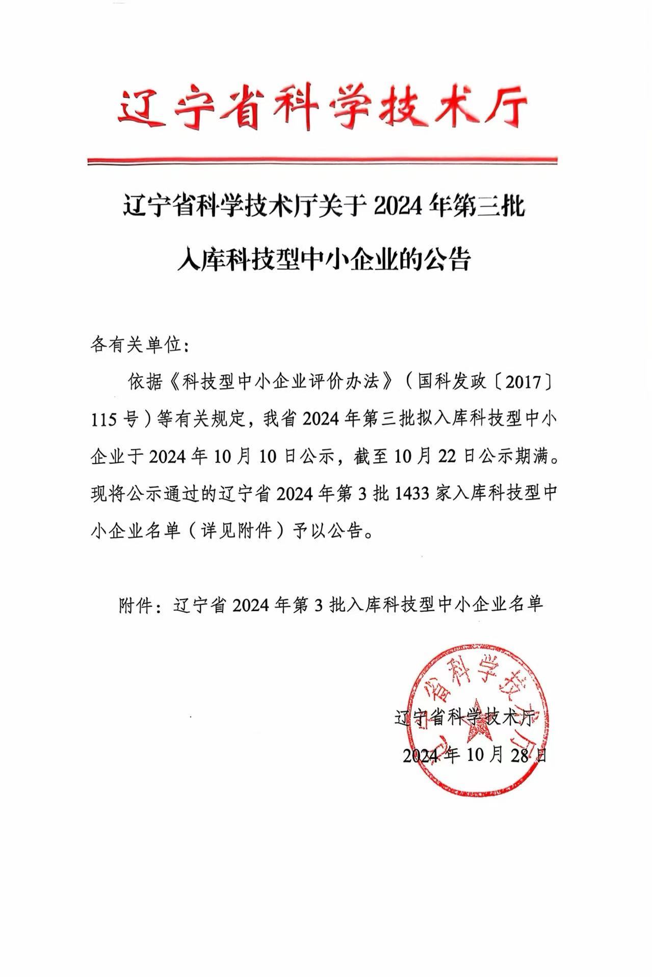 辽宁省2024年第3批入库科技型中小企业名单公告正文.jpg PICTURE